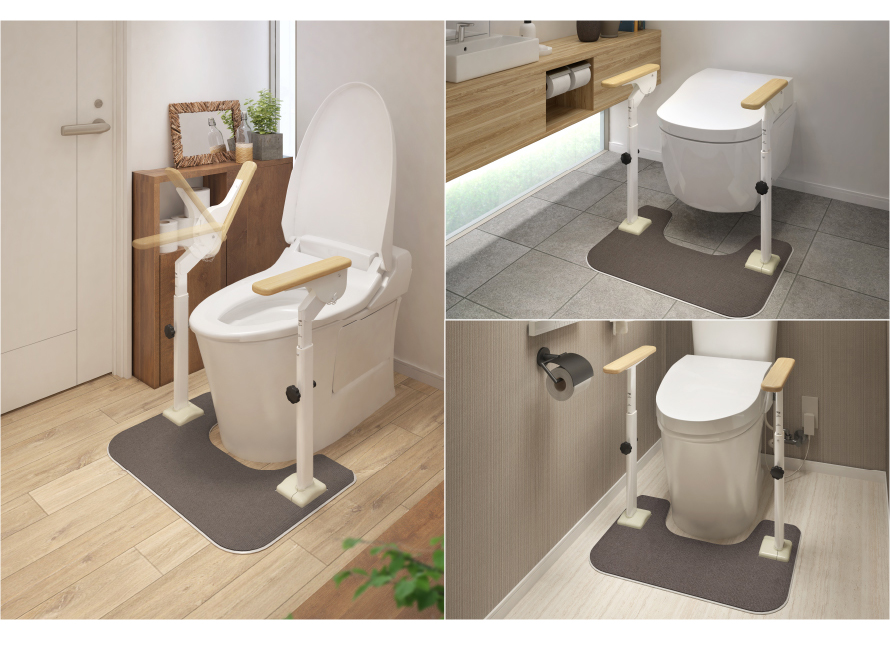 洋式用トイレフレームと違い、置くだけなのでどんなトイレ環境でも設置ができます。 手すりのベース部分にはあまり見ないマットが敷いており、尿臭を防いでくれます。 左右の支柱を回転することで内寸が調整でき、ご利用者様の体格、動きに合わせることができます。